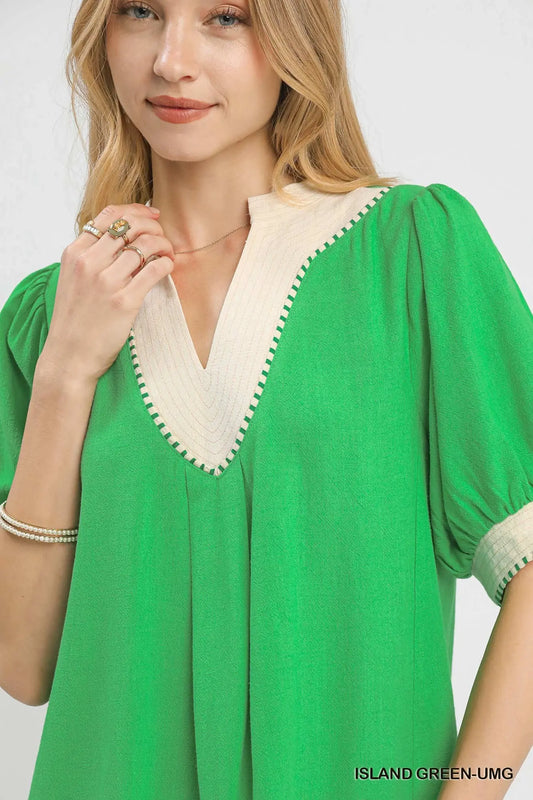 Linen Blend Contrast Trim Top