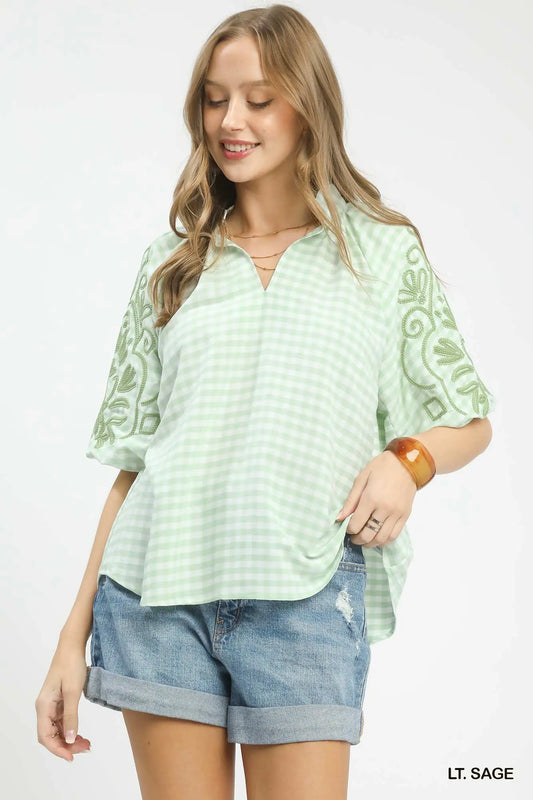 Gingham Embroidered Balloon Sleeve Top
