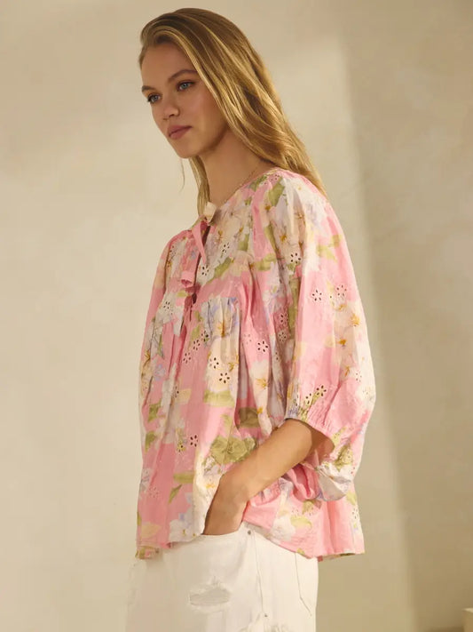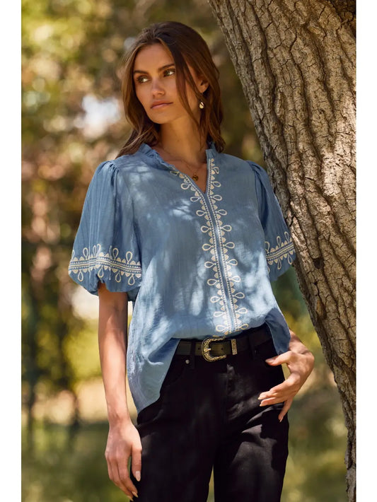 Embroidered Bubble Sleeve Blouse