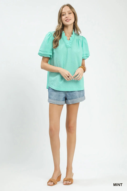 Textured Puff Sleeve Split Neck Top