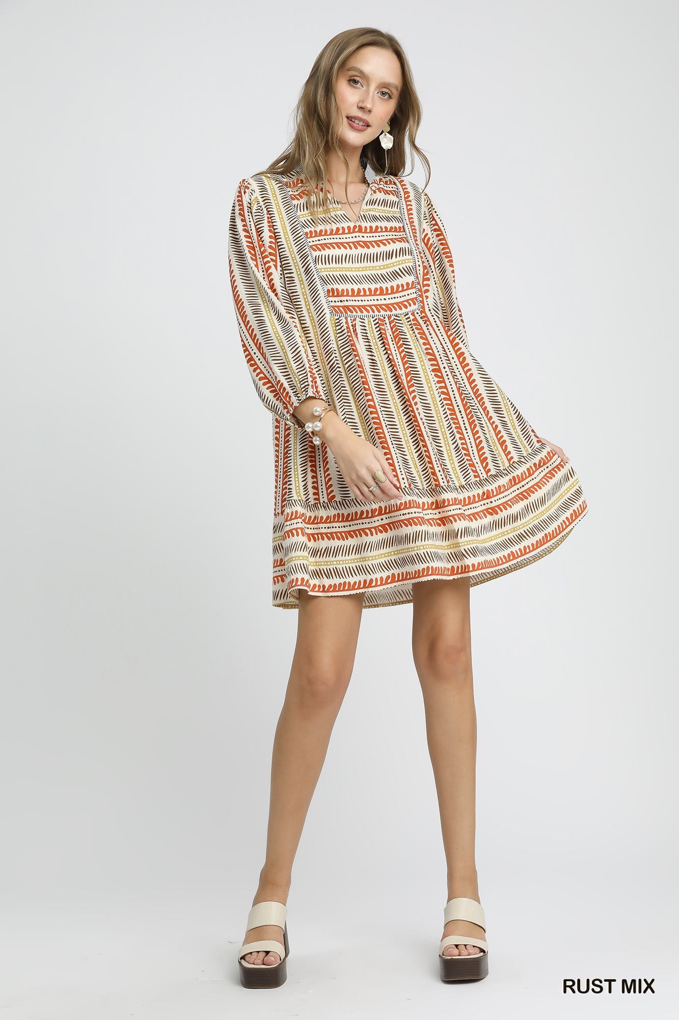 This Aztec Printed Dress features a playful tiered mini babydoll silhouette that flares with every step. The 3/4 sleeves add just the right amount of coverage, while the V-neckline keeps things flirty. Fully lined for comfort, it’s your go-to dress for effortless style with a fun twist.