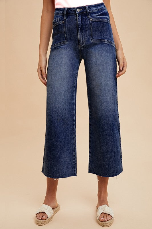 High rise comfort stretch cropped wide leg denim jeans featuring a raw edge hem, pockets, & zip closure.