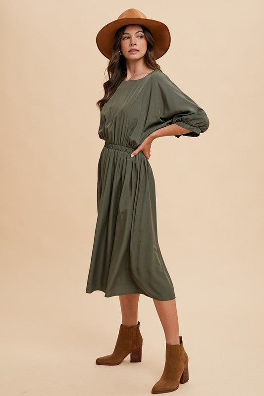 Indulge in ultimate luxury with our Dolman Sleeve Midi Dress. Featuring voluminous dolman sleeves, an elastic waistband, and a boatneck, this loose-fitting dress exudes elegance and sophistication. With a midi length and convenient side pockets, this dress is both flattering and functional. Elevate your wardrobe with this must-have piece.