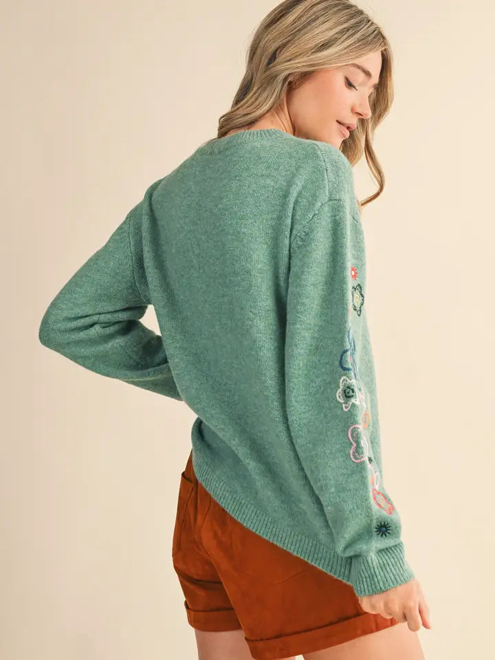 Bloom into style with this charming floral embroidery sweater that brings nature-inspired elegance to your everyday wardrobe. Featuring delicate floral details scattered across the front and sleeves, this pullover offers a relaxed fit with drop shoulders and long sleeves finished with cozy ribbed cuffs. The classic round neckline and ribbed hem create a polished silhouette that pairs effortlessly with your favorite jeans or skirts. Perfect for layering or wearing solo, this sweater combines comfort with a touch of whimsical flair.
