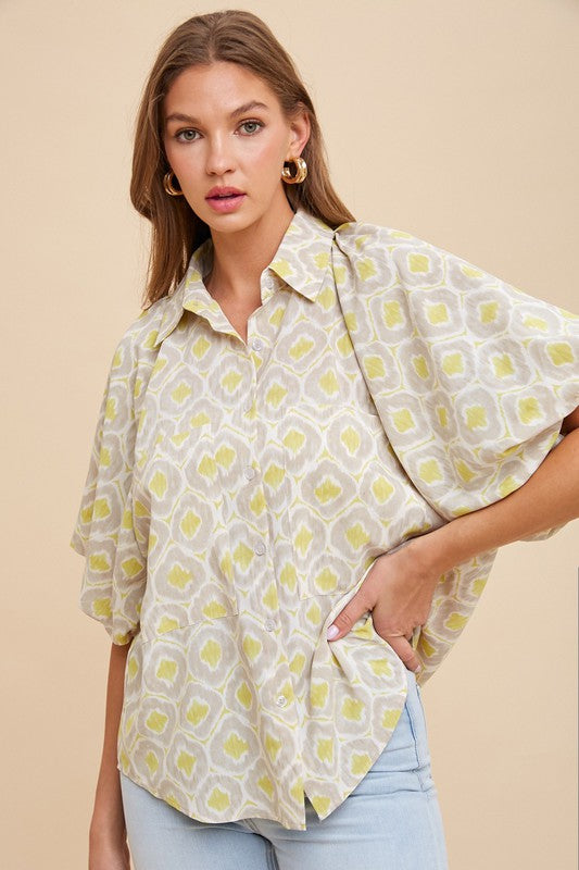 Geometric Printed Bubble Sleeve Button Down Blouse