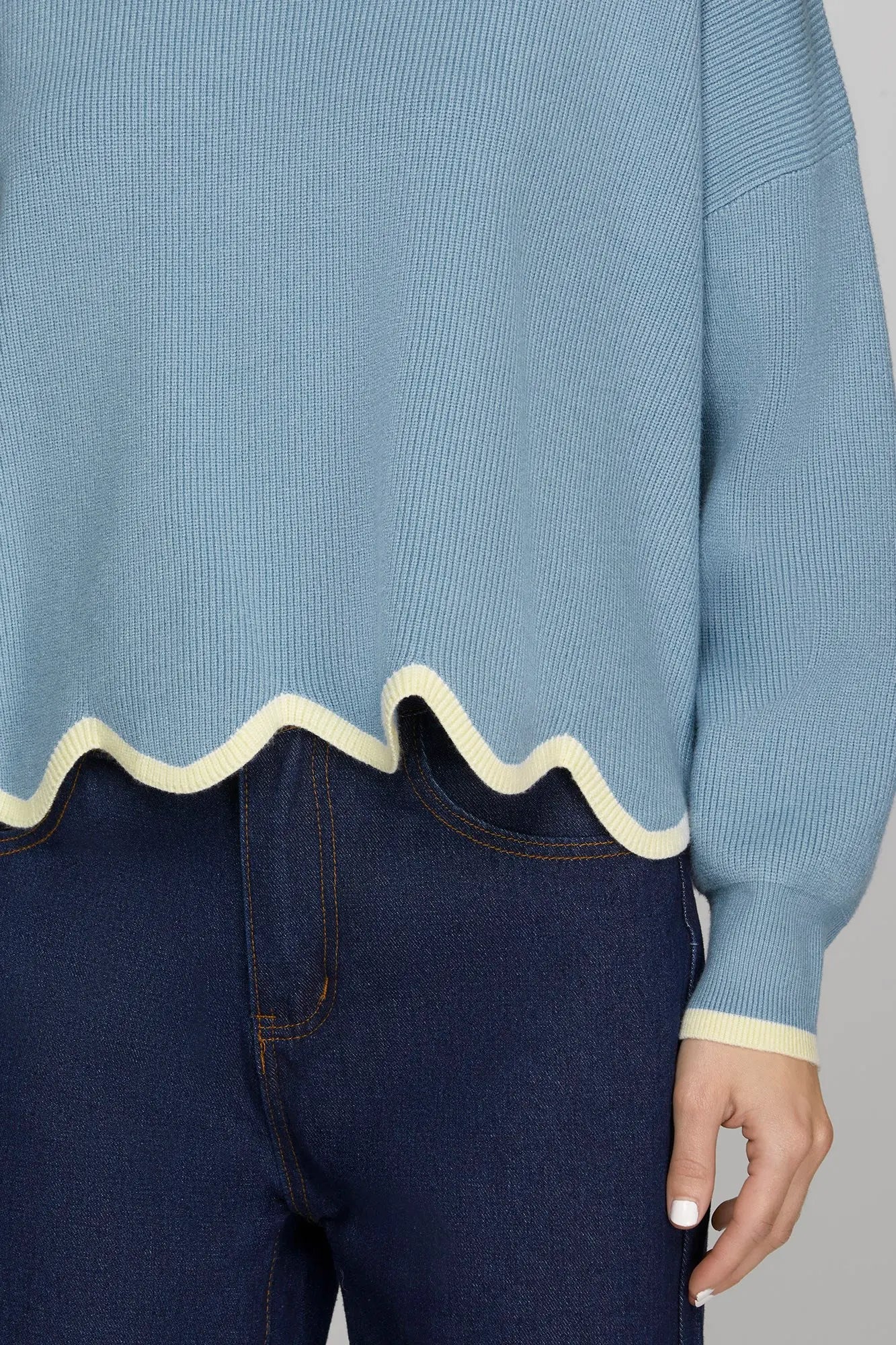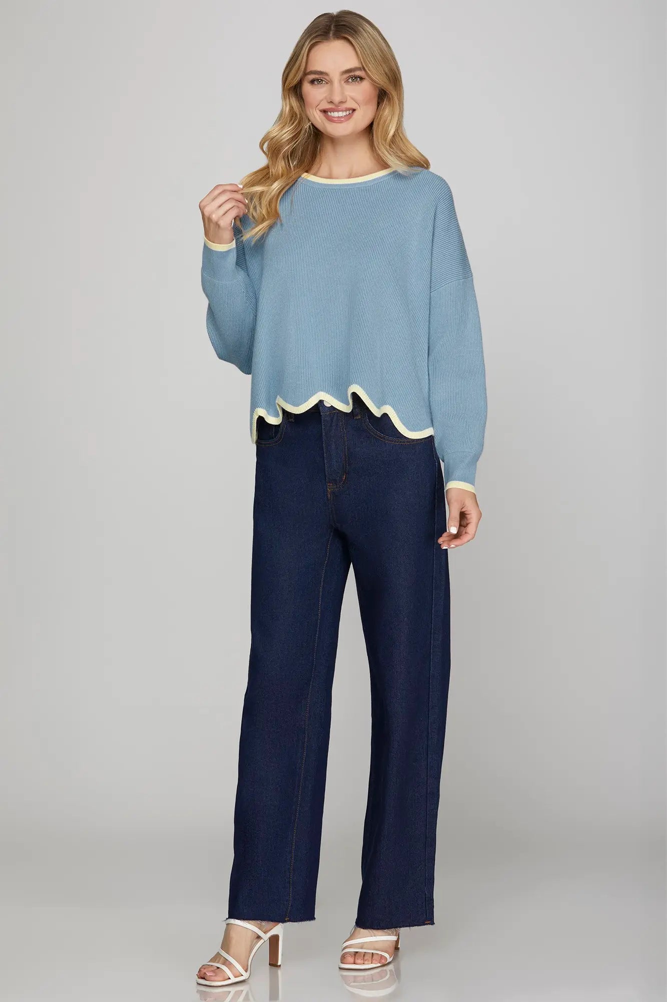 Elevate your everyday style with this charming Scalloped Sweater Top from She + Sky. The long sleeves provide cozy coverage while the delicate scallop hem adds a touch of whimsy and feminine flair. Contrast edge detailing frames the neckline and cuffs for a polished, put-together look that works equally well dressed up or down. Perfect for layering or wearing solo, this versatile piece brings playful sophistication to your wardrobe rotation.