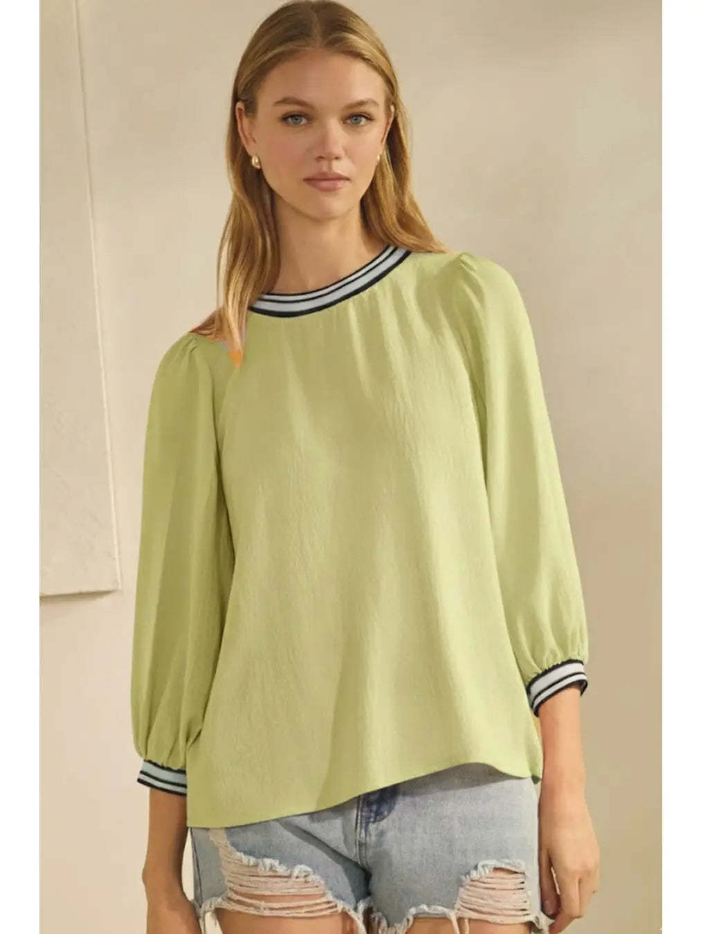 Breathe easy in this breezy airflow top, designed to keep you cool and comfortable all day long. The striped ribbed neckline adds a fun pop of visual interest, while the cuffed balloon sleeves bring a playful, modern twist to your everyday wardrobe. Perfect for layering or wearing solo, this versatile piece is your new go-to for effortless style that doesn't sacrifice comfort.